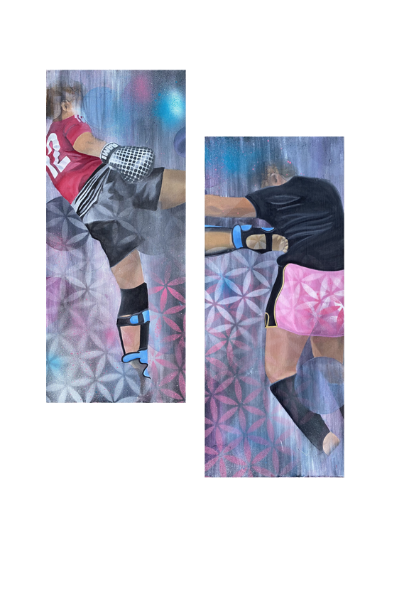 Alleger has trained at combat sports gyms from Portland Oregon to Belgrade Serbia and has experienced a true sense of love from every member, coach and gym she has visited. As the practice involves exercise in trust and respect for oneself and partner, Alleger approaches painting with the same heart full of love, respect, and discipline she has found within those who do the hard work, and commit themselves to being competitive fighters. Her featured fighter series is a love letter to those fighters who welcome artists like herself and everyday enthusiasts of the like into their sacred spaces to train.